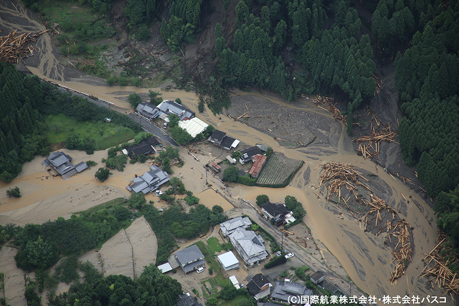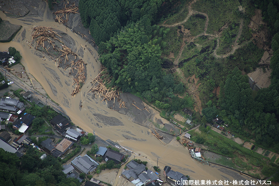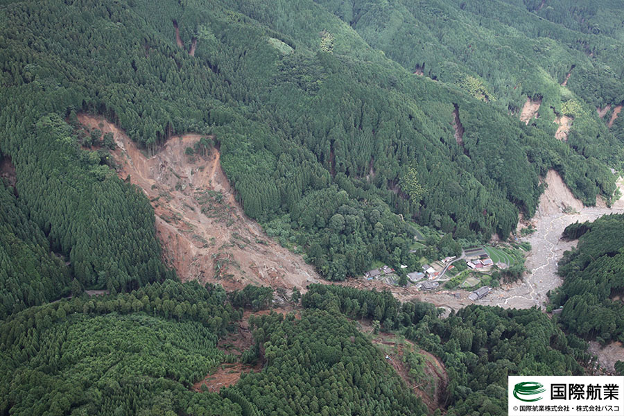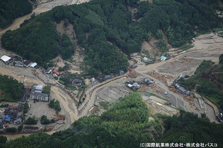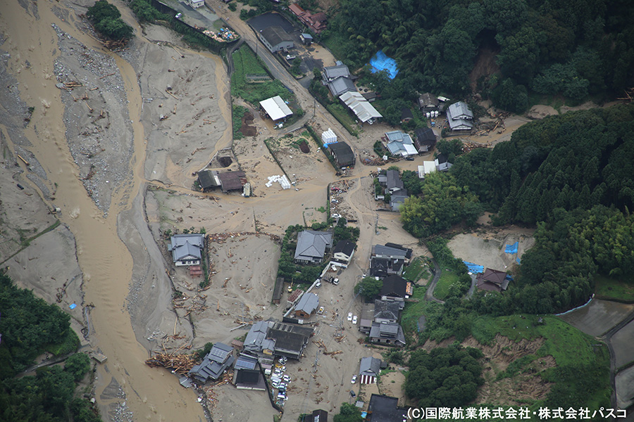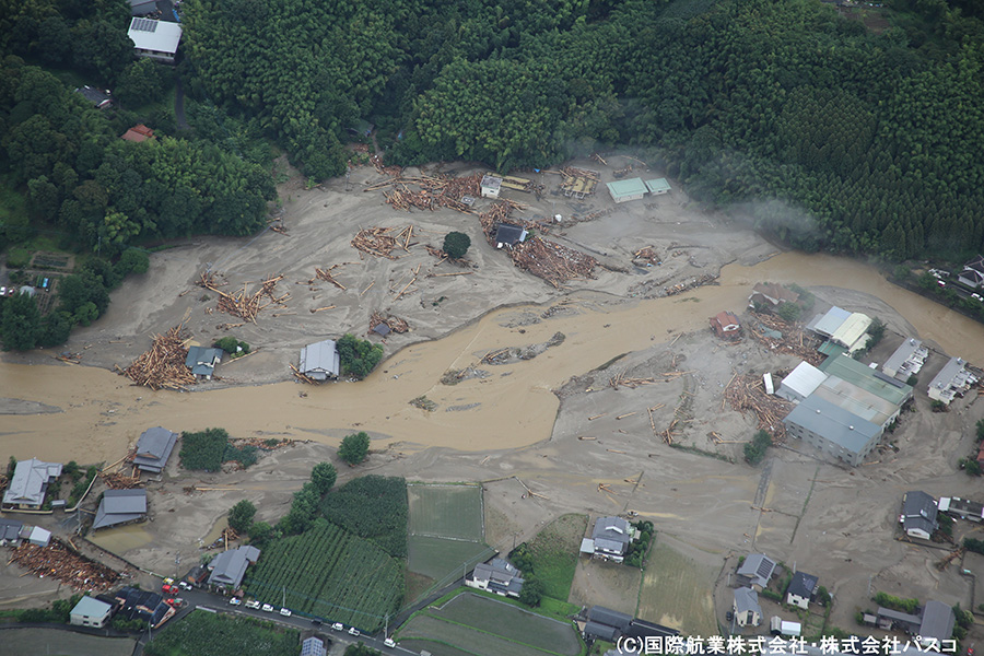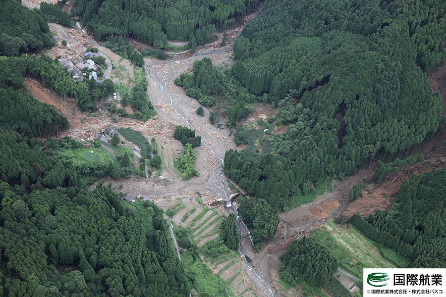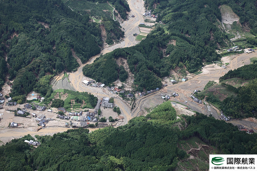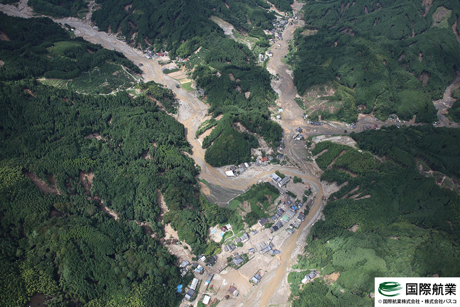 いまだ天候が安定しておらず被害の全容は把握しきれていない状態ではありますが、7月7日および7月9日に一時的に雨が止んだ時間を利用して航空写真の撮影を行いましたので、速報版として掲載いたします。