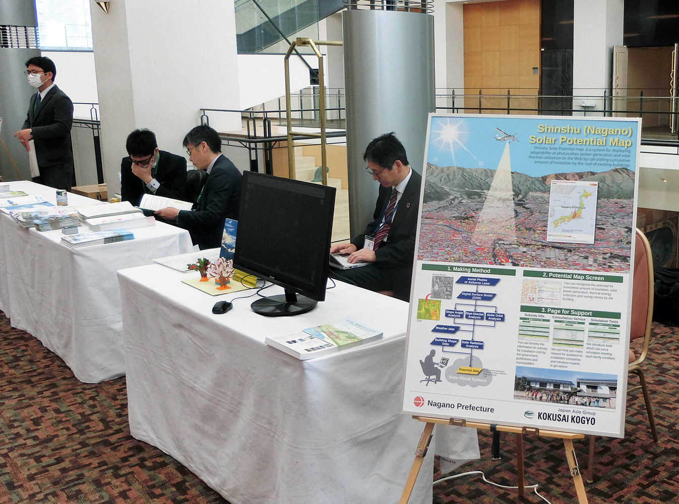 6月に大阪で開かれるG20首脳会合に向け、気候変動に関した議題を事前検討する作業部会(23の国・地域の企業関係者や研究者ら約150名)が、4月15日(月)~17日(水)の3日間、長野市のホテルで開催されました。国際航業は長野県ブースにおいて、長野県と共同で、当社が開発した「信州ソーラーポテンシャルマップ(仮称)」を出展いたしました。