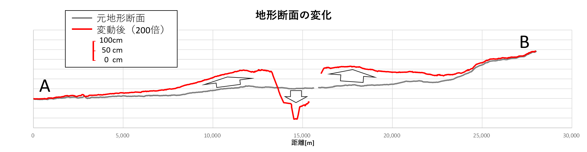 解析結果から、今回の噴火ではゴマの街を境にして、東西へ離れていく動きと隆起する変動、中央では沈下する動きが観測されました。