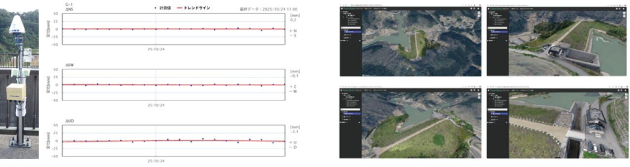 特に、shamen-netが持つ最高約1~2㎜の変位を24時間365日遠隔で監視する高精度なGNSS計測解析技術と、NTNの災害時にも途切れない通信環境を融合することで、アクセス困難なダム施設の点検および平常時の維持管理の高度化・省人化に大きく貢献するダム管理DX手法の有効性を確立しました。