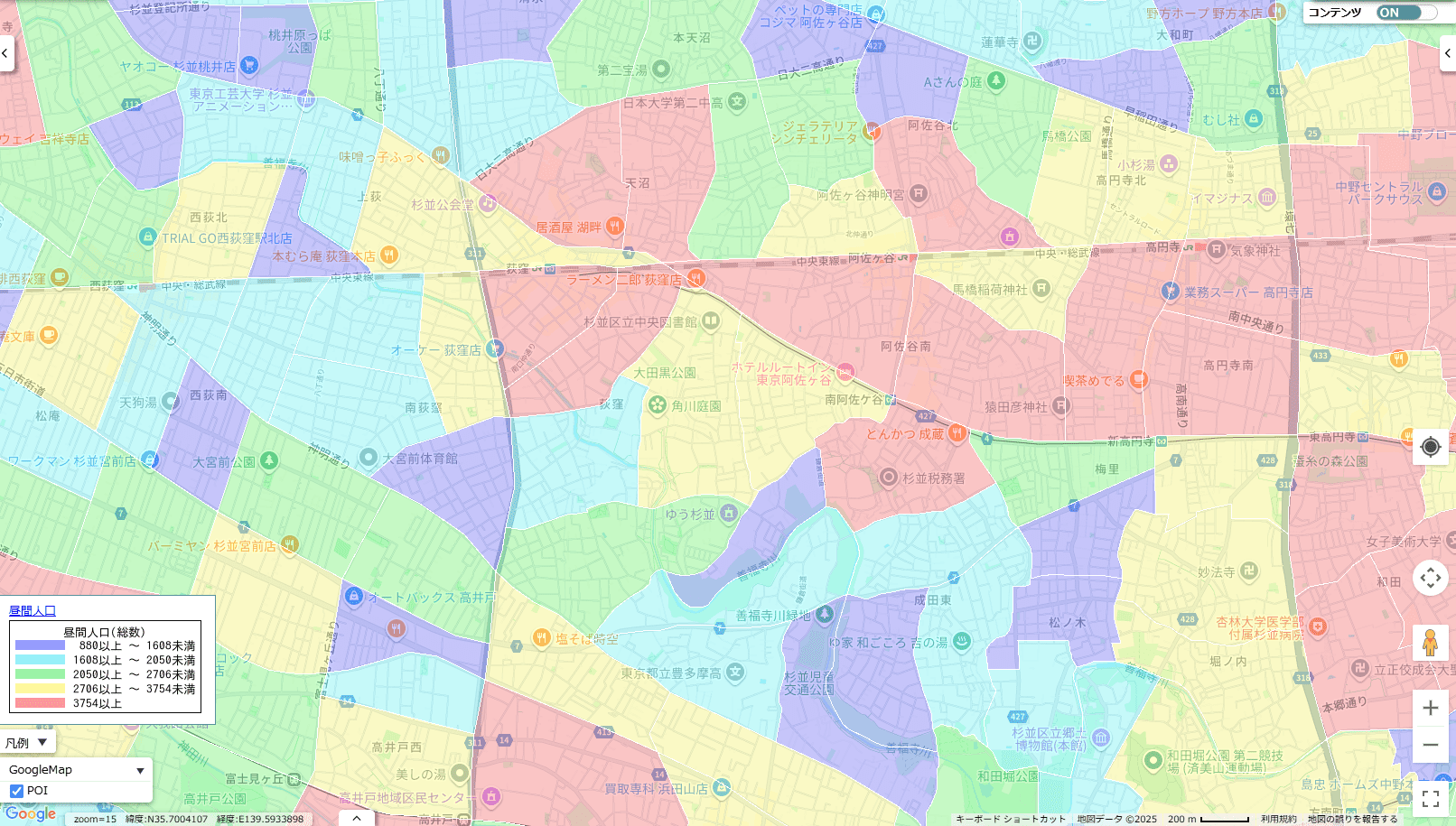 「その土地ではどの事業が成功するのか?」物件を有効活用するには、土地の潜在的な需要と、既存の供給とのギャップを把握することが重要です。人口データと競合物件データを地図上で重ね合わせることで、以下の重要な分析が可能になります。