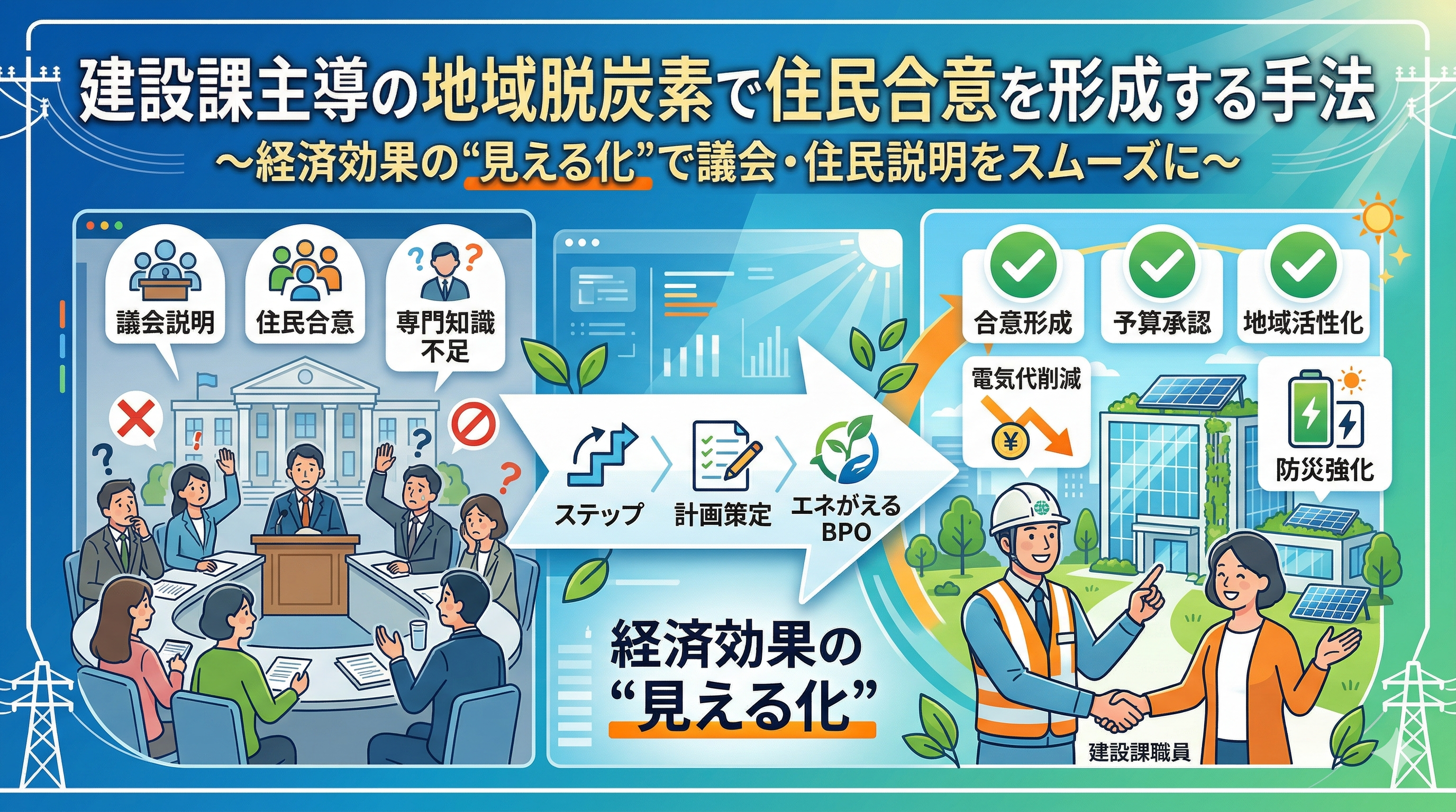 本記事では、建設課が“環境課の補助役”ではなく、施設起点で地域脱炭素を前に進めるキーパーソンであることを整理したうえで、合意形成を進めるための実務的な手法を解説します。ポイントは、経済効果の“見える化”です。数字があれば、議会説明も、庁内調整も、住民説明も、格段に進めやすくなります。