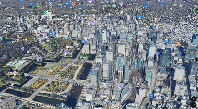 以下は、東京駅を例に、2D地図と3D地図がいかに異なる体験を提供するかを示したものです。