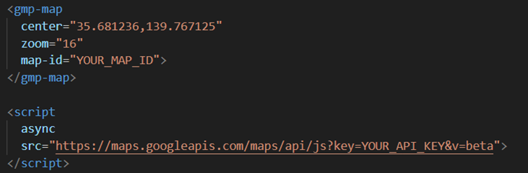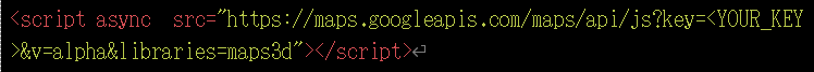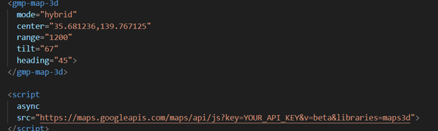 それに対して今回発表されたJavaScript APIで3D Mapを利用できる機能は、Cesium JSやthree.jsなど個別レンダラーを用意する必要が無く、以下のコードのようにGoogleMapsを読み込むために利用されるJavaScript APIを使ってライブラリにmaps3dを指定するだけで3D Mapを呼び出す事ができます。2Dmapと3Dmapの表現するコードにはほとんど異なる点がありません。