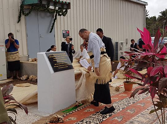 トンガはエネルギー資源に乏しく、輸入ディーゼル燃料に依存しています。同国政府は国家のエネルギー安全保障の観点から、再生可能エネルギーの導入や省エネルギーの推進により、輸入燃料の消費量を削減することを重要な政策課題としています。(写真:蓄電設備棟の全景)