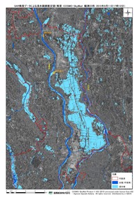 当社では、イタリアのレーダ衛星COSMO-SkyMed衛星により、堤防決壊の約1日後の9月11日17時12分に、茨城県常総市を中心とした撮影を行いました。レーダは雲を透過するため、豪雨災害時や災害直後など、雲が多い天候の中でも地表を撮影することが出来ます。また、浸水した範囲はレーダ波が反射して戻ってこないため、画像上で暗く表現されます。画像処理を行ってその領域を抽出することで、衛星撮影時点での浸水範囲を推定しました。水色の領域が浸水していると推定される範囲です。