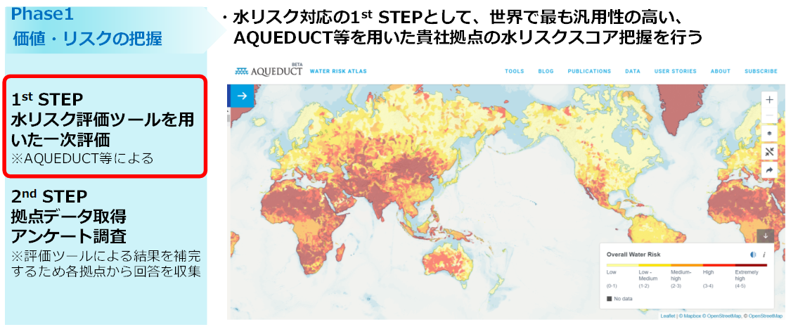 Phase1では、世界中の事業拠点を対象とした世界で最も汎用性の高いAQUEDUCTによる水リスクの一次評価や、結果を補完するために対象拠点のアンケート調査を実施し、拠点ごとのデータを取得・整備した上で、価値やリスクの概要を把握します。