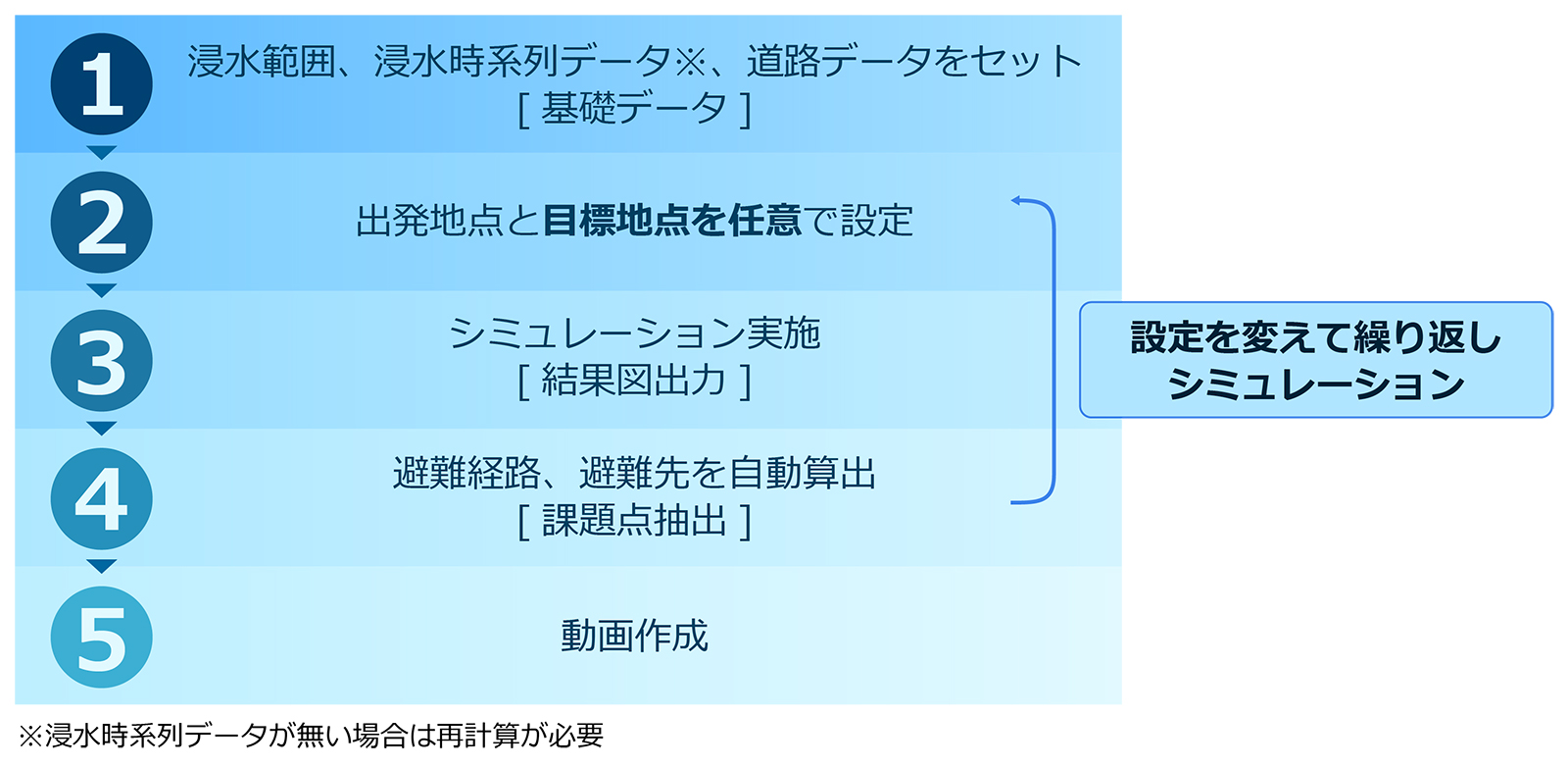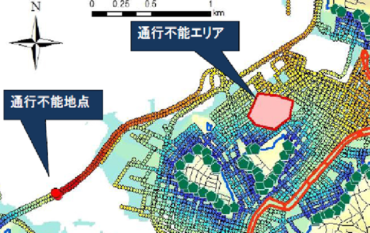 避難者が集中する歩行者渋滞箇所や、津波の河川遡上による回りこみなど、地域の実態や発災状況に近づけた条件でシミュレーションを実施します。