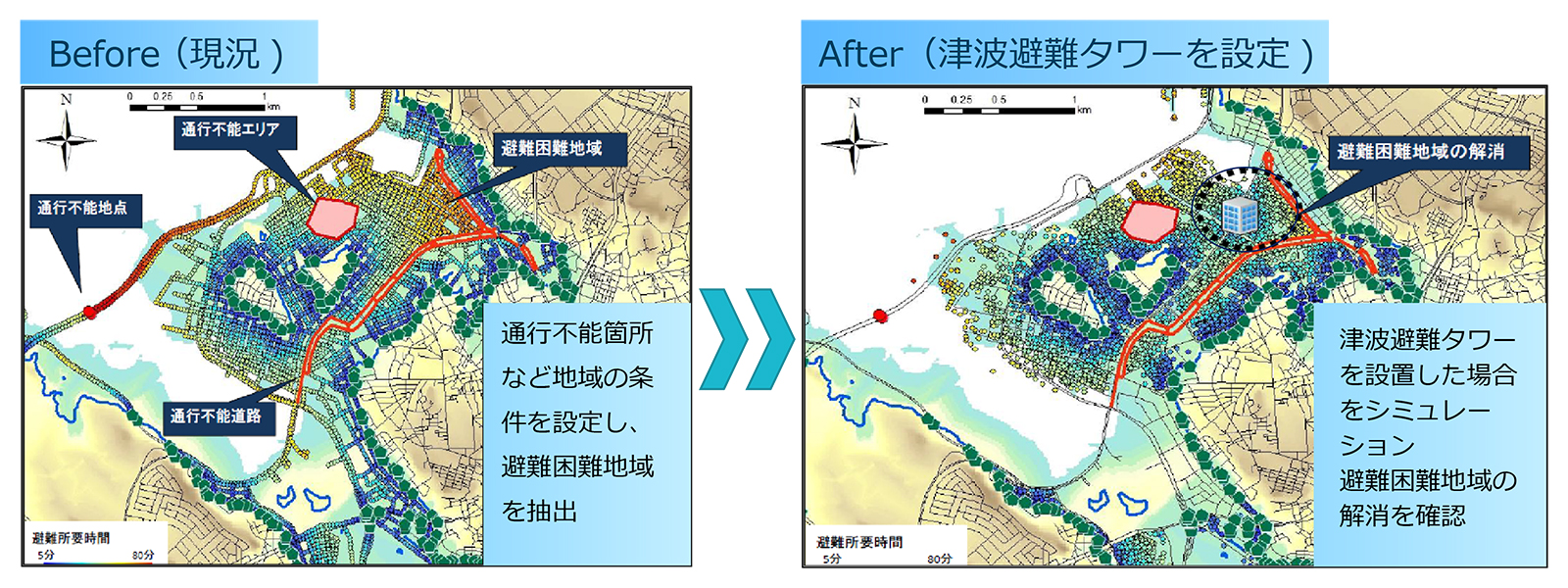 避難場所や避難経路の整備に関する事業を検討する上で、津波避難シミュレーションは、津波避難ビルの新たな指定、津波避難タワーや高台避難路の整備といった防災対策事業を検証・検討するためのツールとして効果的です。