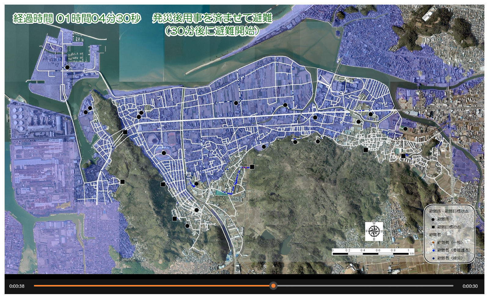 津波避難シミュレーション動画は津波防災事業に対する住民との合意形成の基礎資料として活用できます。「地震発生直後の避難」と「発災後○○分後に避難」などの複数パターンの動画を作成することで、早期避難による効果を視覚的に表現することができます。