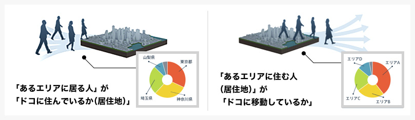 調査するエリアに、 “いつ” “どんな人が” いるか、また、その人たちが “ドコから” “ドコに” 移動しているかが分かります。