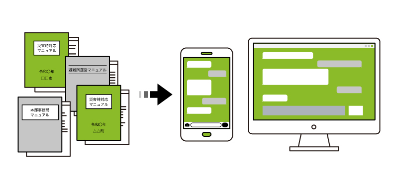 実際のマニュアルを常時携帯できない、膨大なマニュアルの中から現在の業務に関係する情報を把握できないといった課題はありませんか。防災チャットボットはこれらの課題を解決します。