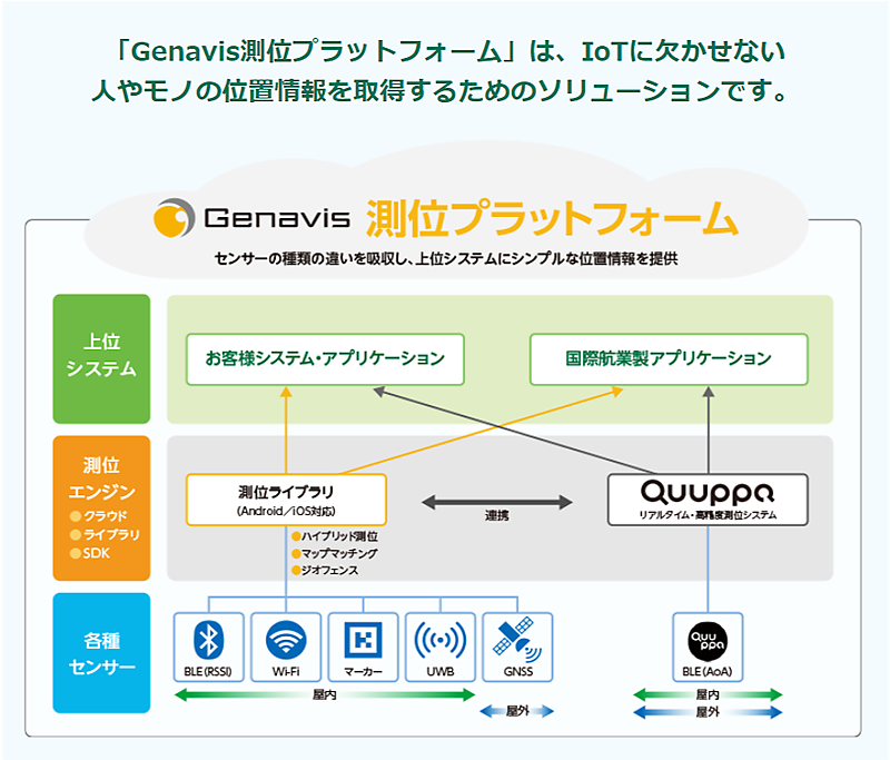 Genavis測位ライブラリはスマートフォン、タブレット、スマートデバイスに搭載可能なシームレス測位機能を提供する、Android及びiOSに対応したソフトウェア開発キットです。