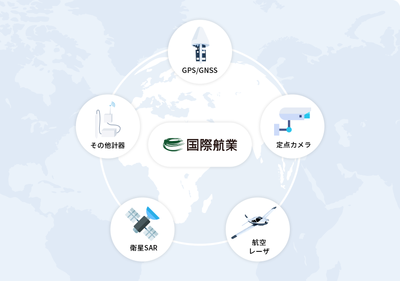 空間情報技術のパイオニアとして、国土建設・環境保全・防災・インフラ管理に貢献してきたノウハウを活かし、GPS/GNSS測位、定点カメラ画像解析、航空レーザ測量、SAR 解析、AIなどの最先端技術を組み合わせ、現在の社会課題を解決するための各種計測監視サービス(モニタリングサービス)をご提供します。