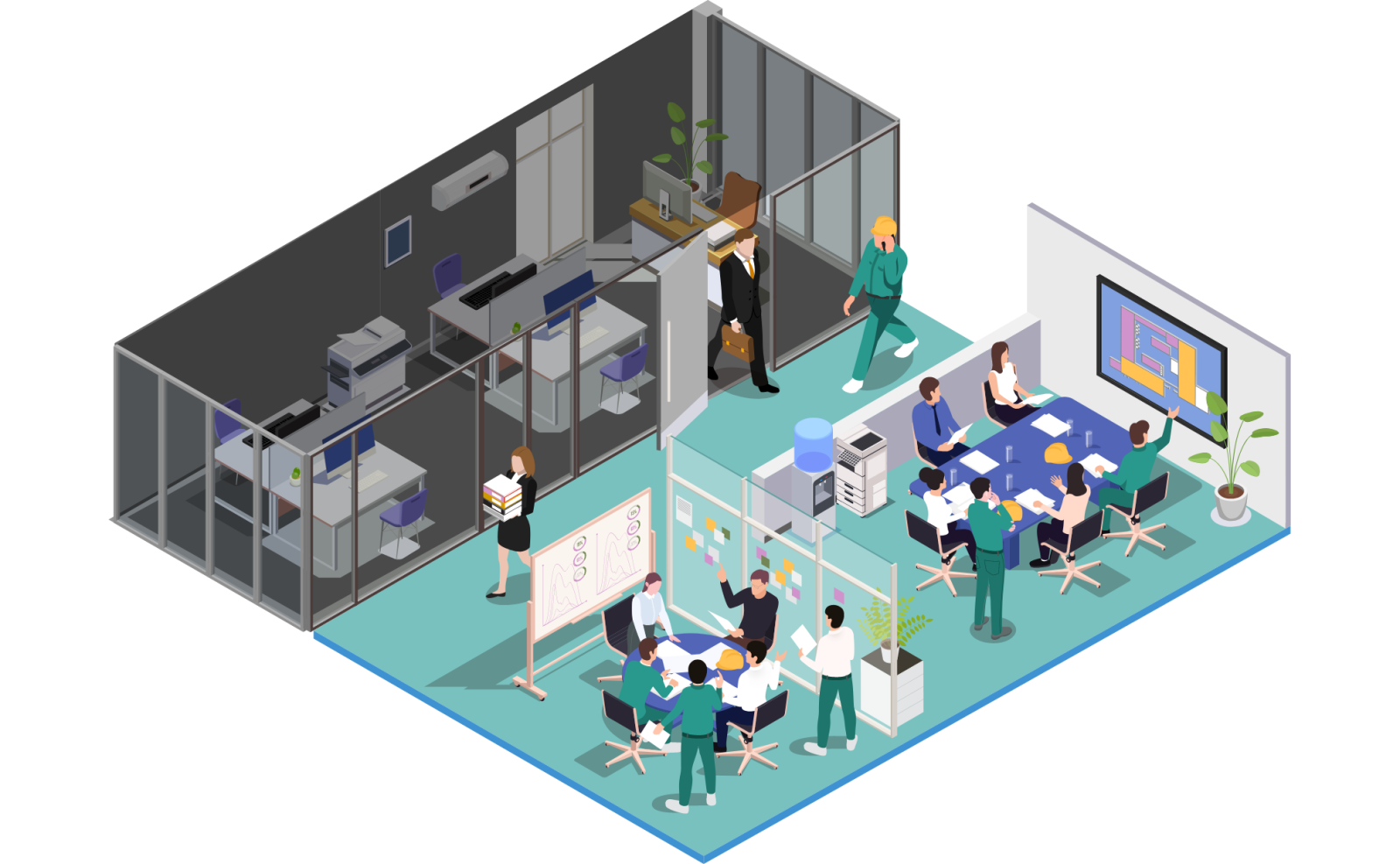 導入効果:誰がどこにいるのかを一目でわかるようになった。さらに人がいるエリアに合わせて照明、空調の自動制御が可能になった。コミュニケーションの時間、誰と誰が議論しているかをビジュアル的に確認できるようになった。