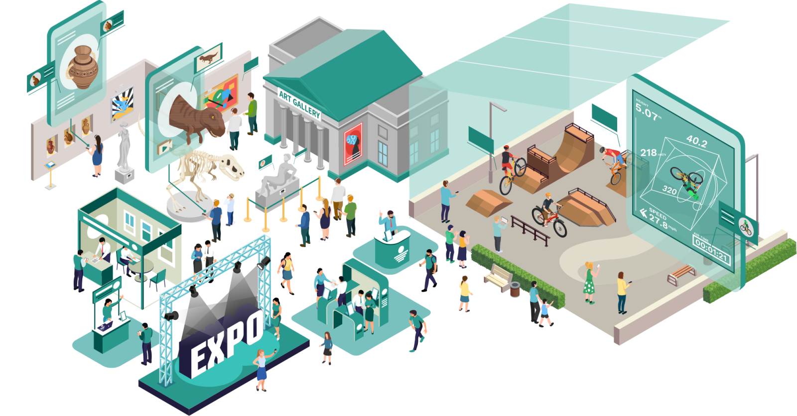 たとえば、来場者の位置取得により人々の興味関心の把握や、位置情報をトリガーに施設内の展示物やアトラクションを作動させる。